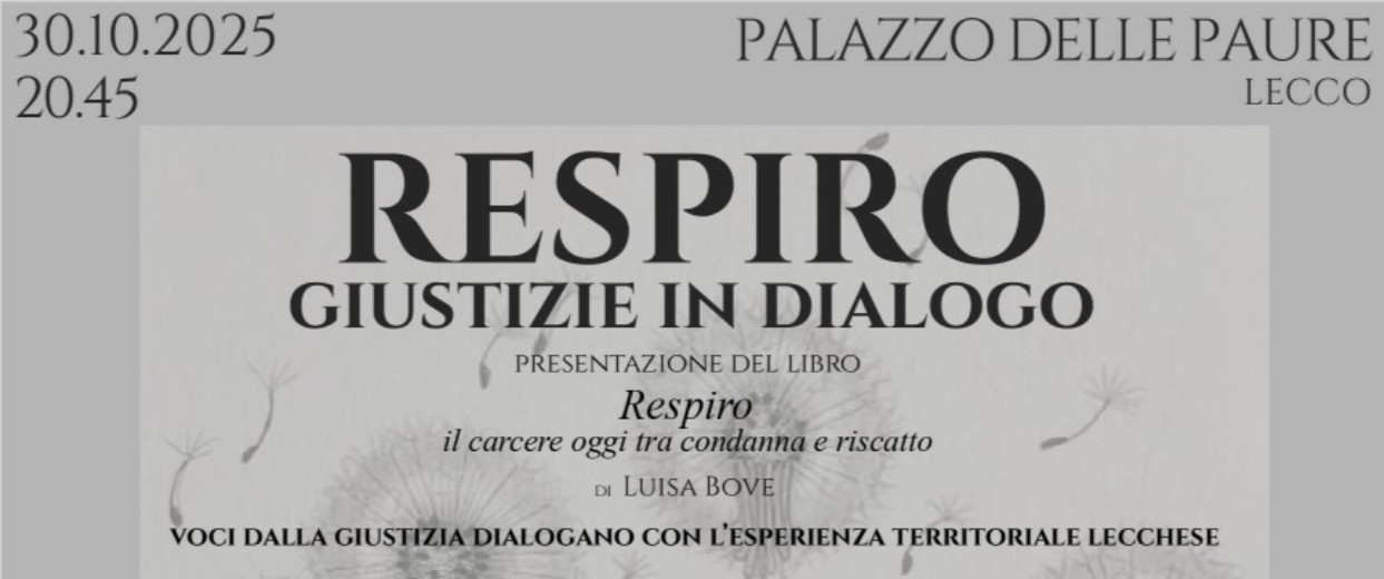 Giovedì 30 ottobre alle 20.45, a Palazzo delle Paure, si terrà l'incontro "Respiro. Giustizie in dialogo", in occasione della presentazione del libro "Respiro. Il carcere oggi tra condanna e riscatto" di Luisa Bove, giornalista per la Diocesi Ambrosiana.